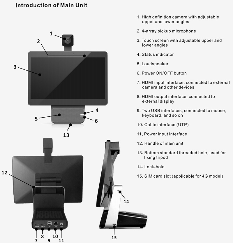 I-5300 (RK3588 version) is an all-in-one smart terminal equipped with a multi-point gesture touch screen. It integrates a 13.3-inch high-definition display, a 4K ultra-clear camera, 4 array microphones, high-performance speakers. It supports 4G (5G needs to be customized) ), wired, WiFi multiple networking methods, supports HDMI OUT output, HDMI IN input, built-in battery 4800mA. Video conferencing software, such as Tencent Conference, can be pre-installed at the factory. Video conferencing can be held with one device without any peripherals.