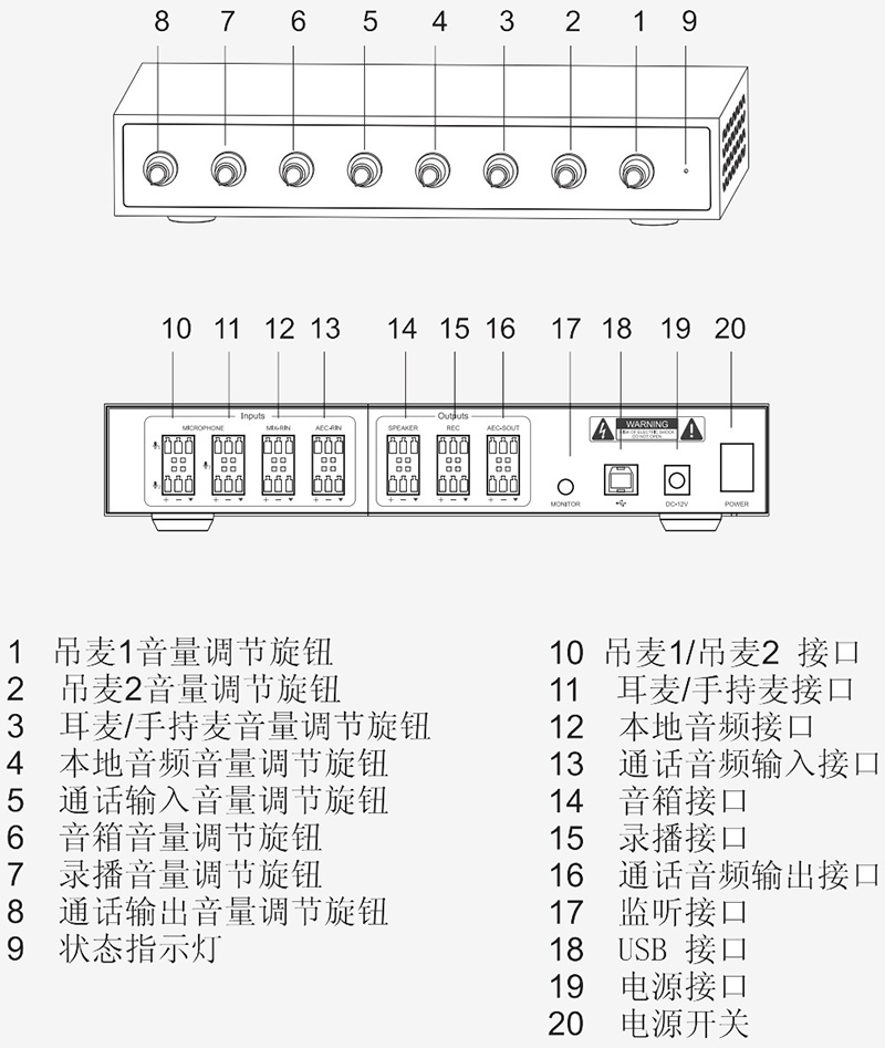 B型USB 接口;3.5mm音頻監(jiān)聽插孔;DC電源接口;6路3.81mm鳳凰接口端子